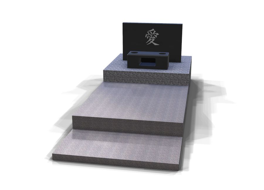 正面の文字「愛」は、お客様が書かれた文字をもとに作成しています。「文字のはらいの部分をもっと長くしたい」というこだわりにお応えし、文字パーツを組み合わせて調整したオリジナルデザインです。 彫刻方法は、当店で「線彫りブラスト」と呼んでいる技法を採用しました。深く彫り込まずに文字の輪郭をラインで彫り、内側は浅く彫ることで、水や埃が溜まりにくく、美しさを保てるのが特長です。文字が読み取りやすいのもメリットです。